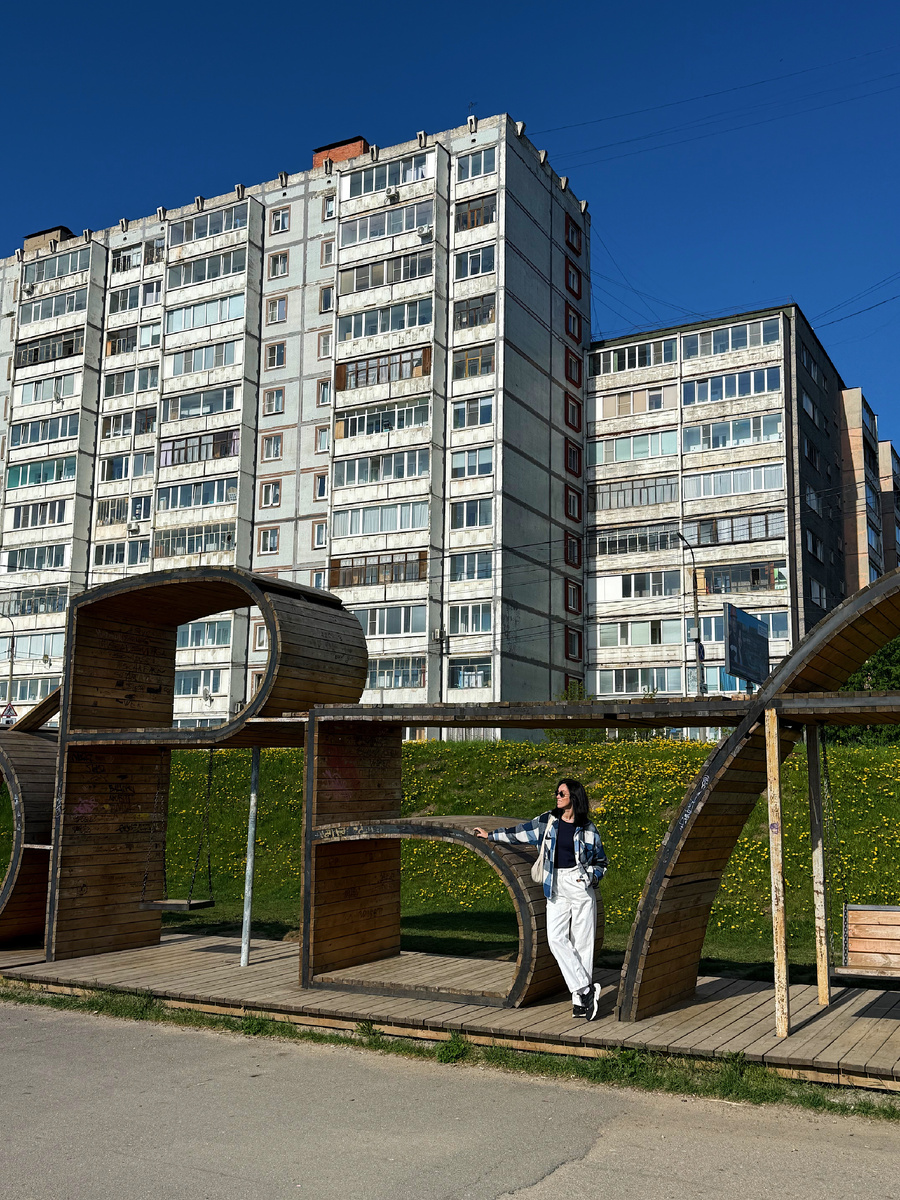 Следующим пунктом нашего путешествия после Тихвина стал Череповец. Мы приехали туда около семи вечера, но как же приятно, что в начале лета дни длинные: успели немного погулять вечером и ещё немного утром перед отъездом. Перед поездкой я посмотрела видео одного блогера, записанное три года назад. В нём Череповец выглядел не слишком привлекательно: унылые улицы, запущенные фасады, странные решения в благоустройстве. Но, к моему удивлению, многое из того, что тогда критиковалось, уже успели исправить. Главные прогулочные зоны в городе - это набережная и улица Советская. Именно там мы и провели всё наше время. Набережную отреставрировали: она стала чистой, аккуратной, с хорошим покрытием, удобной для пеших прогулок и катания на велосипедах. Установили скамейки, урны, фонари - всё современное, но ненавязчивое. Приятно просто идти и смотреть на воду, слушать, как ветер шумит в деревьях. Улица Советская тоже изменилась. Появились удобные скамейки, клумбы, элементы городской среды. Всё это