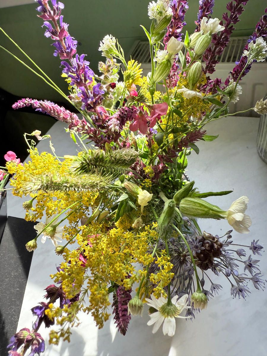 Недавно мой муж пришёл с работы с букетом. Не розы, не тюльпаны, не что-то из цветочного магазина. Просто — охапка полевых цветов. И в этот момент я поняла: ничто не сравнится с тем, что собрано руками, с душой, по пути домой. Букет оказался удивительно красивым. Фиолетовые колоски шалфея, жёлтые воздушные соцветия — возможно, зверобой или репешок. Белые кружевные цветочки — как у тысячелистника, тонкие травинки с пушистыми “хвостиками” злаков. Розовые лепестки — скорее всего, мотыльковые, как у дикого люпина. Честно скажу, я не уверена, как называются все эти растения, но мне это и не важно. Они словно говорят на языке лета — простого, настоящего, родного. Я поставила их в простую стеклянную вазу и долго рассматривала. Букет был не “правильный”, не симметричный, но именно в этом — его живость и сила. Он напомнил мне детство: венки на лугу, запах свежескошенной травы, солнце на плечах. Муж потом признался, что просто не смог пройти мимо — поле цвело так ярко, и он решил принести м