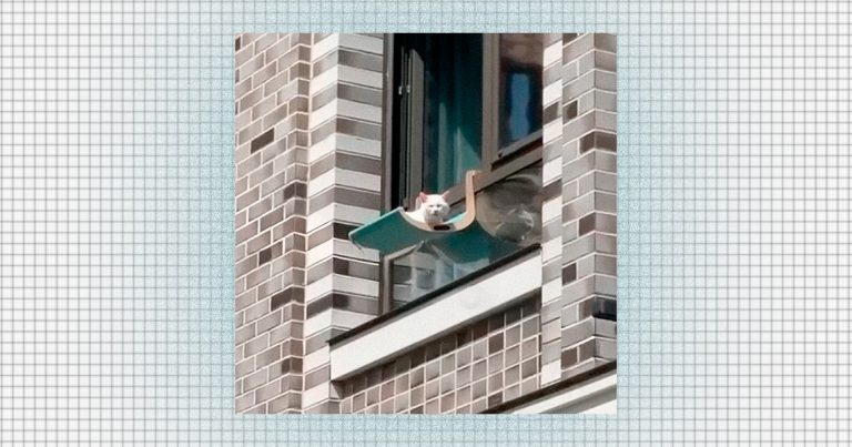 Москвич установил на окне экстремальную открытую лежанку для кота