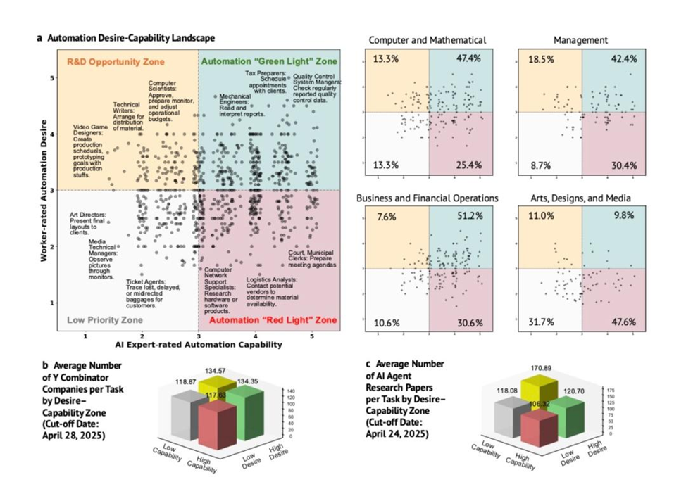 С января по май 2025 года команда экономистов под руководством Эрика Бриньолфссона и Ицзя Шао провела масштабное исследование: были опрошены 1500 американских сотрудников и 52 AI-эксперта, а также проанализированы 844 конкретные задачи из 104 профессий. Главный вопрос — какие задачи люди действительно хотят автоматизировать с помощью искусственного интеллекта?