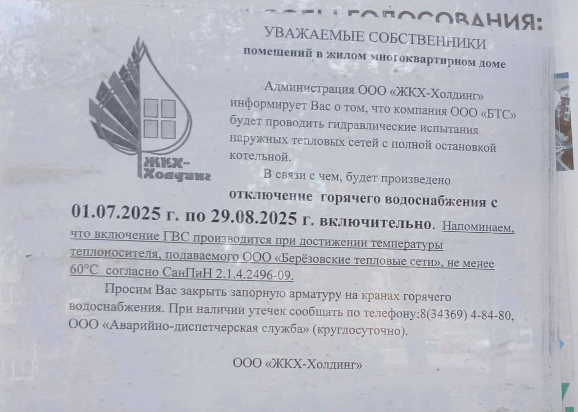 В ответ на пост А пока в Березовском обещают отключить горячую воду только на будни следующей недели, жители Новоберезовского слегка удивлены (тут другое слово, весьма емче должно быть, но оно не прошло цензуру). В микрорайоне с 1 июля воду отключат до… конца августа. @zg66
