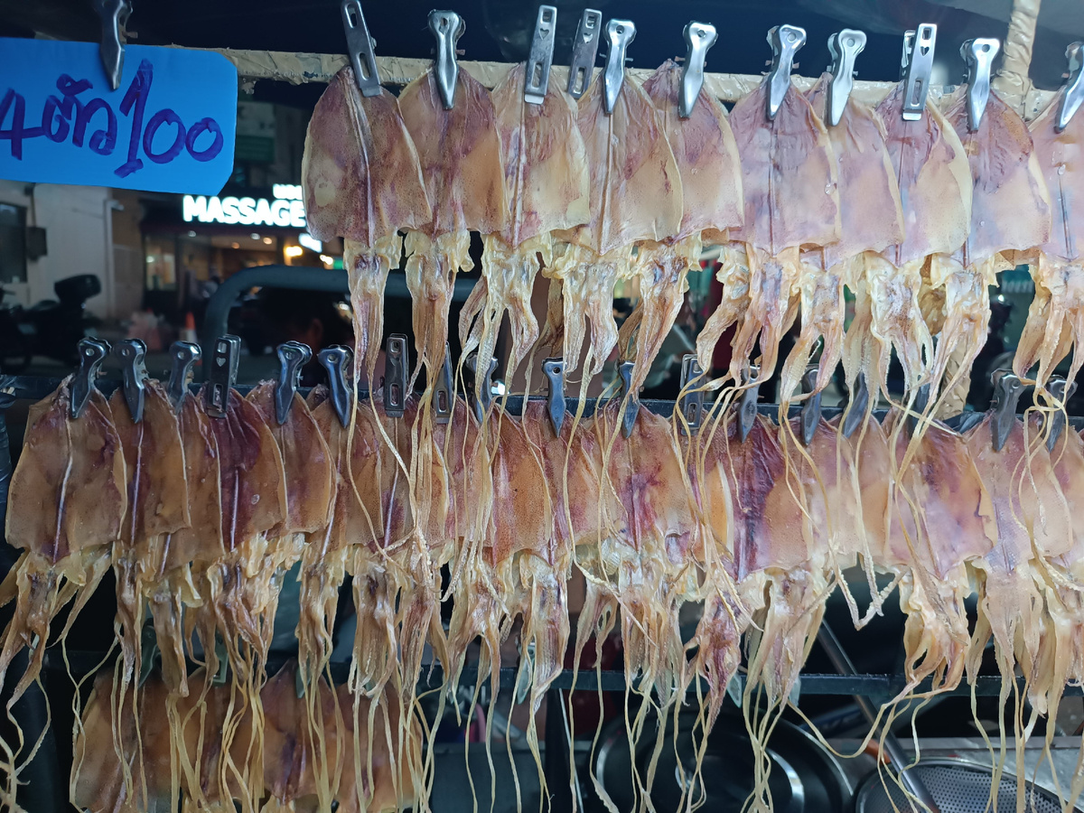 На улицах можно увидеть макашницы (торговая точка на колёсах) с висящими сушеными кальмарами. Особенно эффектно выглядят в подсветке фонаря в тёмное время суток. Мы покупали сушеные кальмары в небольшой упаковке в Биг С — хоть какая-то гарантия, что не отравишься. Уже в квартире пытались их разогреть в СВЧ, на плите — не того вкуса мы ожидали. Когда-то 25 лет назад на рынке в Елизово (Камчатка) мы пробовали вяленого кальмара высушенного целиком. Он просвещался на свету, а вкус!!! Запомнился на всю жизнь.