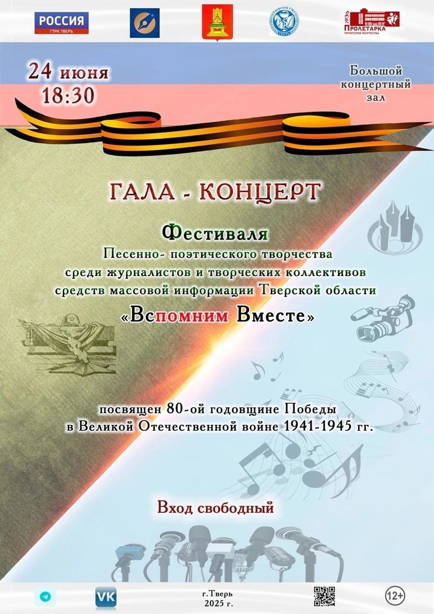 🎶 ДК «Пролетарка» приглашает на фестиваль творчества журналистов и коллективов СМИ «Вспомним Вместе» 24 июня Тверской областной Дворец культуры «Пролетарка» совместно с Тверским региональным отделением Союза журналистов России при поддержке Правительства Тверской области и регионального Министерства культуры проводит II-й патриотический фестиваль творчества журналистов и коллективов средств массовой информации Тверской области «Вспомним Вместе». Главная идея патриотического проекта – сохранение исторической памяти через атмосферу песенного и поэтического творчества, рожденного в военные и послевоенные годы. На фестивале можно будет познакомиться с песенным и поэтическим творчеством журналистов из Молоковского, Бельского, Торжокского, Селижаровского, Ржевского, Нелидовского районов Тверской области и города Тверь. Также будет представлено самодеятельное творчество лучших коллективов ДК «Пролетарка». Гостем фестиваля станет Александр Евдокимов – тверской певец, композитор, участ