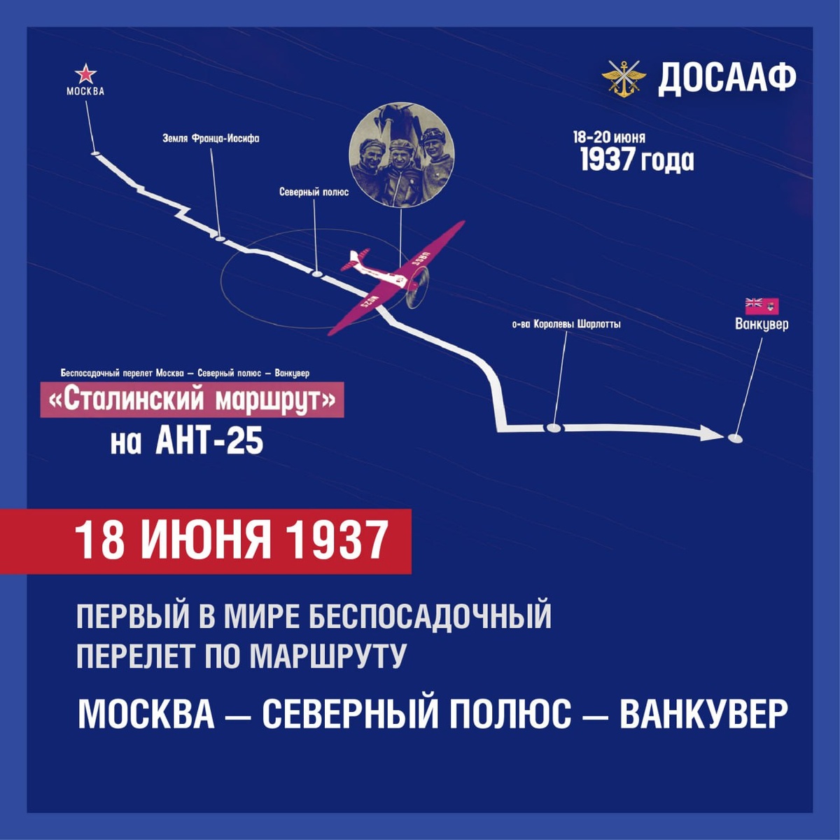 Первый в мире беспосадочный перелёт по маршруту Москва — Северный полюс — Ванкувер 18 июня 1937 года, советские летчики Валерий Чкалов, Георгий Байдуков и Александр Беляков на самолете АНТ-25 преодолели авиамаршрут Москва – Северный полюс – Ванкувер без единой посадки, установив мировой рекорд дальности полета. Этот триумф стал возможен благодаря безупречному мастерству экипажа, инженерному гению советских конструкторов и невероятному мужеству покорителей неба. Перелет имел колоссальное значение – он доказал возможность трансарктических авиационных маршрутов и открыл новую эру в мировой авиации. В условиях полярного дня, при температурах ниже -20°C в кабине и постоянной угрозе обледенения, экипаж проявил высочайший профессионализм. Особенно сложным был финальный этап – посадка в Ванкувере с почти пустыми баками. Этот подвиг укрепил международный престиж СССР и вдохновил тысячи молодых людей связать свою жизнь с авиацией, пройдя через аэроклубы Осоавиахима. ДОСААФ России гордится с
