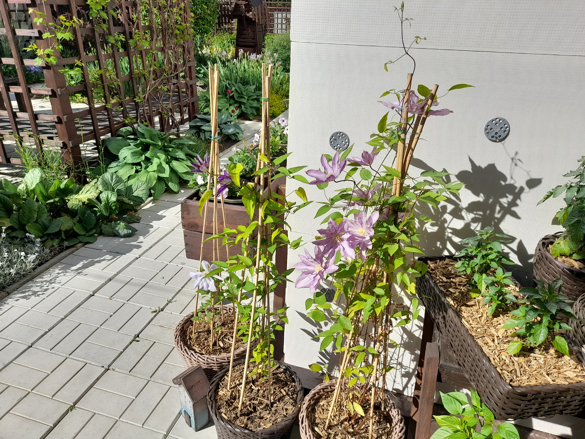 Напомню, что второй год я выращиваю клематисы второй группы обрезки в кашпо. В грунте они у меня очень плохо растут, а какие-то и не цветут. Все выкопала и пересадила в кашпо объемом 12 литров. В кашпо воткнула по 4 бамбуковых опоры и сделала для растений вигвам. В прошлом году этих сооружений клематисам вполне хватало. В этом они быстро освоили опоры и двинулись дальше. Ветром плети погнуло и мне пришлось их обрезать до высоты вигвама. То, что обрезала пустила на черенки. Это хорошо, но стало понятно, что данных опор клематисам катастрофически не хватает и нужно что-то решать. Я давно мечтала, чтобы дом был частью сада. Мне очень нравятся дома, увитые какими-то лианами. Но высаживать в грунт рядом с домом что-то я не хочу. Начиталась отзывов о девичьем винограде, как он корнями и ветвями портит строения и решила, что пусть лучше дом будет отдельно. И вот мне в голову пришла идея полноценных шпалер. Только узких и более изящных. Весной их можно втыкать в кашпо, а на зиму убирать. Они