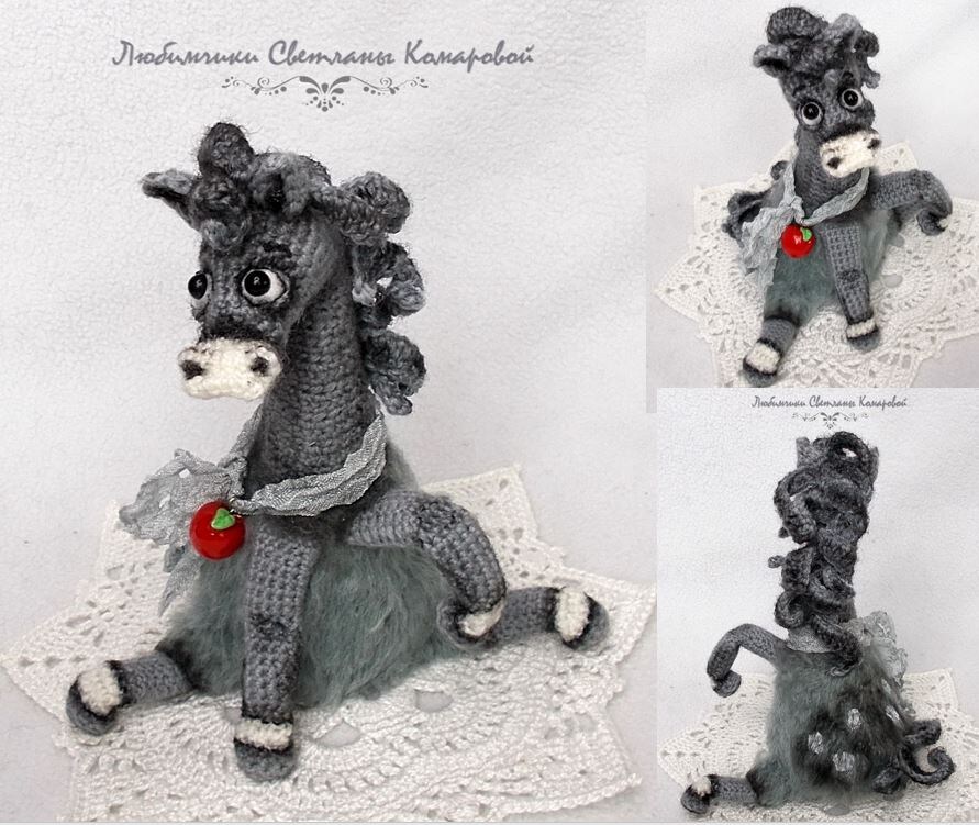 Общая высота у меня 14см.Без шплинтов и крепежей. Голова неподвижна, конечности ввязаны и сгибаются. Все замены материалов на своё усмотрение. В мк вязка лошадки. Оформление средне-подробное. мк-150р Материалы: -нитки полушерсть Детский каприз(225/50гр) серый и белый-ДК - Камтекс хлопок травка(кхт) тёмно-серый/или без них и всё ДК -кхт -крючок 1,5мм -глаза :белые помпоны 5-6мм+чёрные полу-бусины 4мм+веки из дк :связать 6в.п. -наполнитель -секундный клей - тонировка-перманентный чёрный маркер и мас.пастель - липучка,украшалки