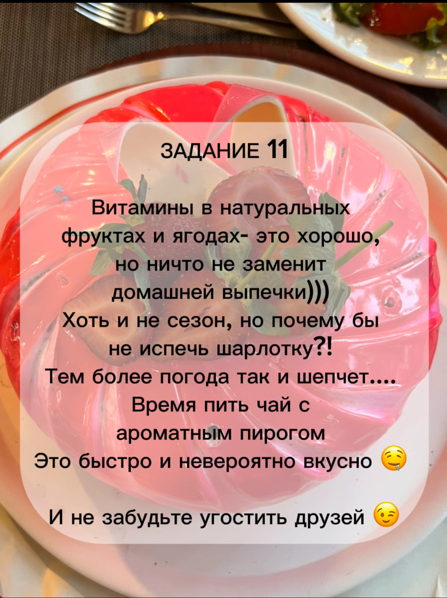 Вот что что, а поесть я люблю. Тем более вкусно)) Тут еще и погода наша благоволит для вкусных чаепитий)) Так что не знаю как вы, а я уже выполнила задание и планирую наслаждаться результатами сразу после того, как шарлотка остынет)) Тем более она у меня не простая, а с корицей, медом и двумя видами орехов)) это вам не абы что на отвали)) это с душой и сердцем)) так что у меня будет отличный вечер, чего и вам желаю 😉