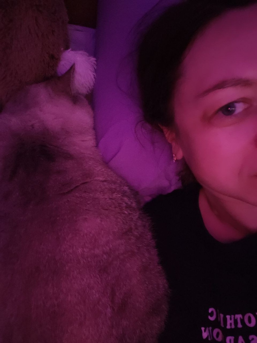 Кто переживал за секретаря Майю. Не переживайте. Она похудела, чувствует себя прекрасно. Вот лежит рядом, мурчит. Пузо начало обрастать шерстью, шва не видно совсем. Цвет фото такой от подсветки)))