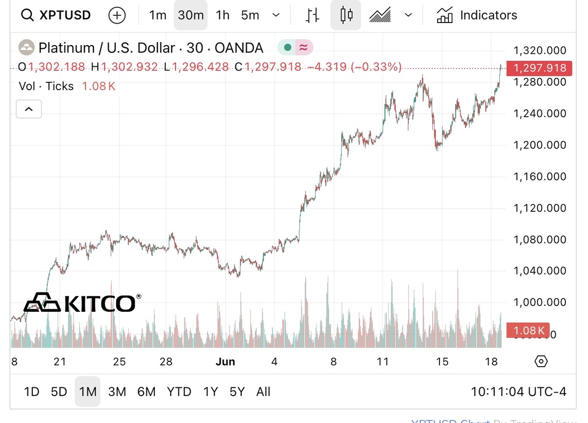 При этом прослеживается обратная корреляция с золотом. Когда после начала бомбардировок Израилем Ирана, золото подскочило, платина, наоборот, снизилась.