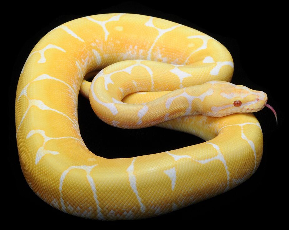Лавандовый питон- редкая рептилия,разновидность шаровидного питона Тело толстое, мощное, с коротким хвостом. Большая широкая голова хорошо отграничена от шеи. Глаза рубиново-красные Обычно змеи рождаются белыми со светлыми жёлтыми пятнами, но по мере взросления пятна становятся ярче, а кожа приобретает сиреневый оттенок, из-за чего питоны и получили своё название лавандовые питоны — ночные животные, часть дня проводят в своём убежище. У самок длительный период беременности — до 9 месяцев. при хороших условиях и содержании животное может прожить минимум до 30 лет. лавандовый питон — один из самых мелких, достигает в длину 1,2–1,8 метров. питается грызунами, цыплятами, хомяками. неприхотлив в содержании, не агрессивный, спокойный История появления этих животных связана с тем, что два селекционера в 2003 году узнали о продаже пары лавандовых питонов в Африке. Змеи были альбиносами и представляли интерес для науки и любителей змей. После селекционеры начали получать потомство от купле
