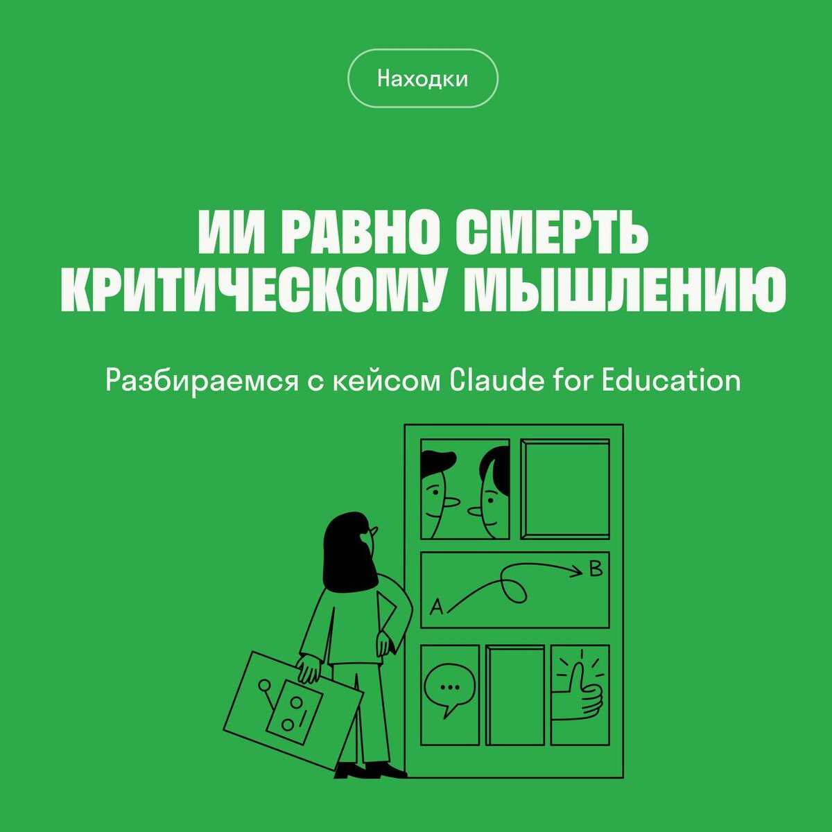 Нашей рубрике «Находки» в июне тоже быть. Сразу к делу: один из свежих кейсов — запуск Cloude for Education от компании Anthropic. Это отдельная версия Claude для университетов, где особое внимание уделено режиму Learning, в котором ИИ не даёт готовых ответов, а помогает студентам рассуждать самостоятельно. В карточках разъясняем ключевые идеи проекта и отвечаем на вопрос, почему критическое мышление в будущем никуда не исчезнет, а очень даже наоборот.
