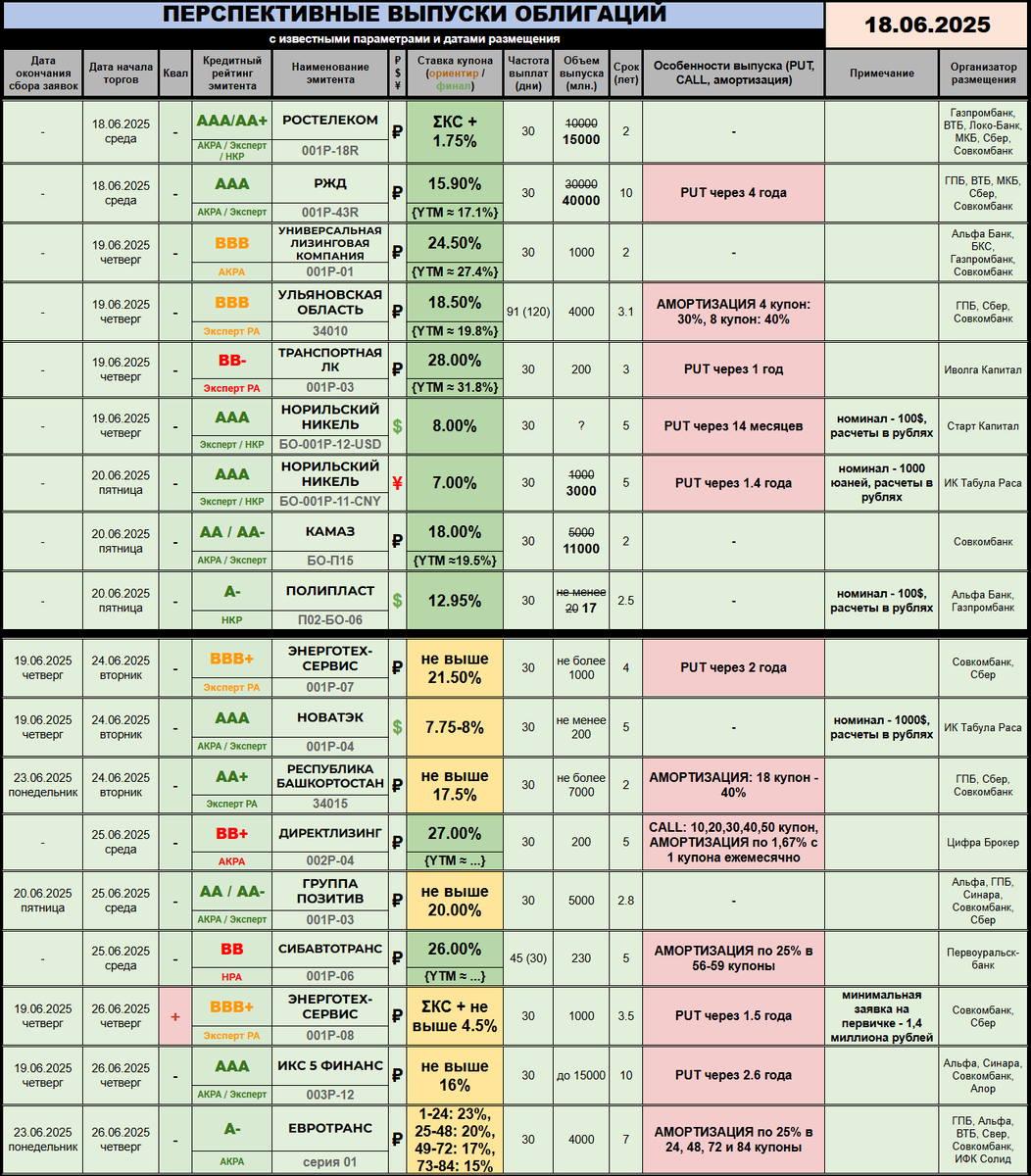 ---------- 🆕 НОВЫЕ РАЗМЕЩЕНИЯ / АНОНСЫ: 🔆 НОРИЛЬСКИЙ НИКЕЛЬ (🅰️🅰️🅰️) сообщил, что уже завтра начнет торги квазивалютной бумагой БО-001Р-12-USD. Раз столь оперативно, то, с большой вероятностью, нас там не ждут. Параметры сообщу к сведению: 5 лет торгов, пут-оферта через 14 месяцев, номинал одной бумаги - 100 долларов, ежемесячный купон 8% ровно. Организатор закулисной вечеринки - Старт Капитал. 🔆 БАШКОРТОСТАН (🅰️🅰️➕) с превеликим удовольствием примет заявки на выпуск 34015 объемом не более 7 миллиардов рублей 23 июня. Двухлетние бумаги не снабжены офертой, но вот амортизация в 40% от номинала запланирована через 1,5 года торгов. Ориентир ежемесячного купона - не выше 17,5%, что, конечно, просто расчудесно :) И да, в свете ухода от риска спрос тут может вполне превысить предложение :) Организаторы - ГПБ, Сбер и Совкомбанк, а начало торгов предварительно запланировано