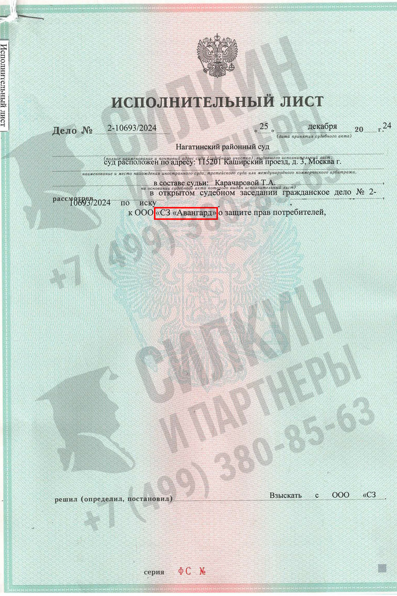 После вступления судебного решения в законную силу нами было получено исполнительное производство — исполнительный лист, который был направлен в банк совместно с договором купли-продажи (ДКП). Данная процедура позволила избежать применения моратория, распространяющегося исключительно на договоры долевого участия (ДДУ).