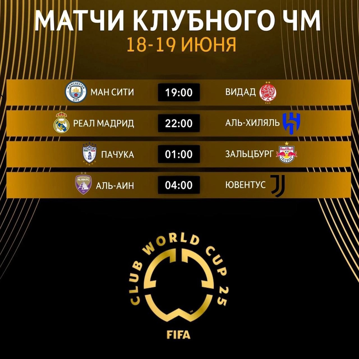 ⚽ Расписание матчей Клубного чемпионата мира (18–19 июня): 🇬🇧 Ман Сити — Видад 🕖 19:00 🇪🇸 Реал Мадрид — Аль-Хиляль 🇸🇦 🕙 22:00 🇲🇽 Пачука — Зальцбург 🇦🇹 🕐 01:00 🇦🇪 Аль-Айн — Ювентус 🇮🇹 🕓 04:00 #КлубныйЧМ #ClubWorldCup #футбол #футбол2025 #матчдня #RealMadrid #ManCity #Juventus #Pachuca #AlHilal #Wydad #AlAin #Salzburg #FootballNews #footballrave @footballrave