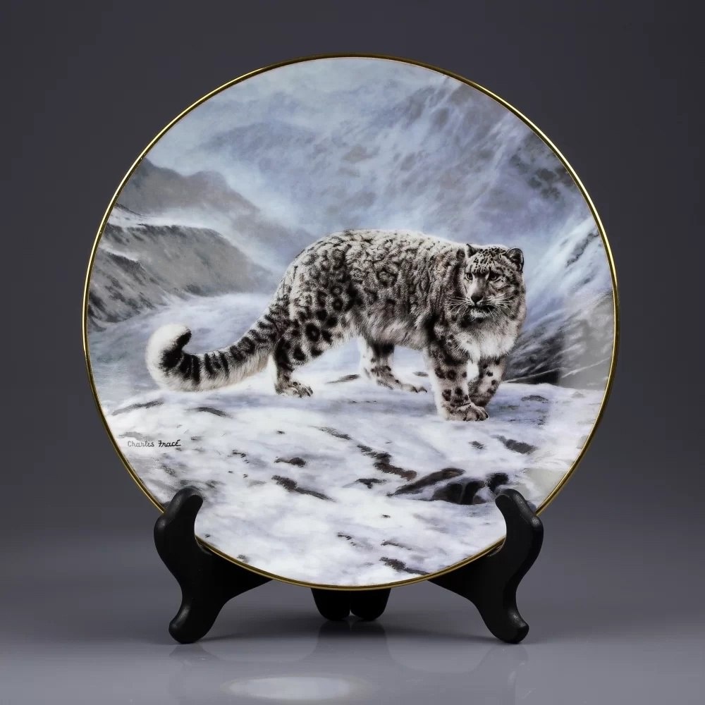 Перед вами коллекционная фарфоровая тарелка, а не просто посуда — это "Fleeting Encounter" (Мимолётная встреча), создана по мотивам работы знаменитого американского художника-анималиста Чарльза Фрэйса, выпущена в 1991 году. На ней снежный барс идёт по снегу, как будто знает, что он шикарен (и что его печатают на фарфоре). Художник Чарльз Фрэйс явно любил барсов — и пафос, и грацию, и чтоб немного азиатских склонов для антуража. В общем, тарелка не для борща, а для восхищения. 🐾 Кот Пикассо 🐈⬛ Искусство