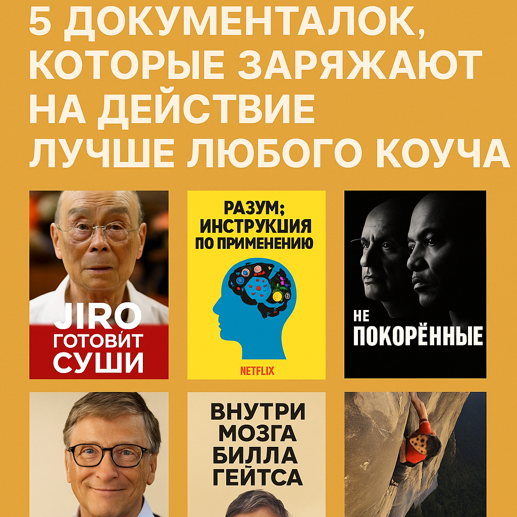 Есть фильмы, после которых хочется лечь спать. А есть те, после которых ты встаёшь и начинаешь действовать. В мире документального кино немало работ, которые не просто вдохновляют — они меняют мышление, дают толчок, вытаскивают из болота прокрастинации и помогают предпринимателю вспомнить, зачем он вообще начал. В этой подборке — 5 документальных фильмов, которые можно включить вместо мотивационного тренинга. Только без воды и псевдонаучных лозунгов. Только настоящие истории, пот, труд и результат. Сохраняйте — пригодится в любой момент, когда начнёт казаться, что всё идёт не так. О чём: История 85-летнего мастера суши Дзиро Оно, чье заведение из 10 посадочных мест стало культовым. Его главная философия — бесконечное совершенствование.