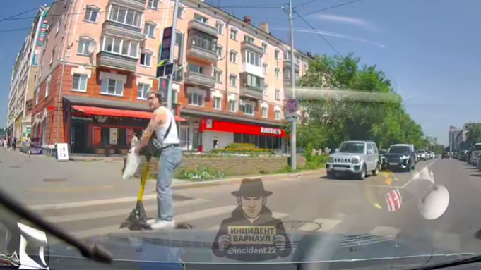 Водитель не сдержался в выражениях, из-за чего самокатчик захотел с ним "поговорить" В Барнауле на проспекте Ленина автомобиль чуть не сбил самокатчика, решившего "пролететь" дорогу на красный. Кадрами едва не случившегося ДТП делится "Инцидент Барнаул". На записи с видеорегистратора видно, что водитель уже начал движение, но, заметив парня на самокате, резко остановился. От столкновения их отделили пара мгновений и совсем небольшое расстояние. Водитель "в доходчивой форме" порекомендовал самокатчику впредь спешиваться, переходя дорогу. "Слезь с самоката, [глупец]!" — крикнул он. Самокатчик, услышав грубое наставление, жестом подозвал водителя к себе, однако тот не стал выходить из автомобиля и продолжил движение. Больше материалов на amic.ru.