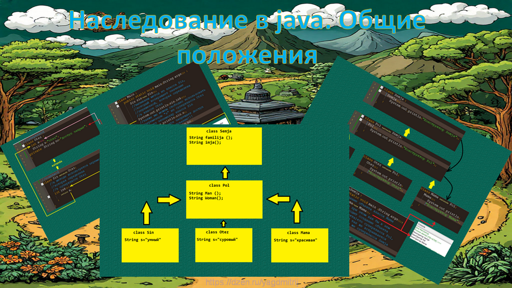 Наследование в java очень непростая тема и возможно ее придется разбить на несколько статей. Исходя из названия, можно догадаться, что речь идет о наследовании свойств и характеристик от другого. В java - это самый обыкновенный класс, который может наследоваться от другого класса. Ярким примером из жизни будет сын, который унаследовал от отца зеленые глаза, форму головы, но при этом имеет свой уникальный характер, присущий только ему. Организация наследования в java происходит с помощью ключевого слова extends. class Sin extends Otez { } Класс Sin наследует некоторые характеристики (методы и переменные) класса Otez, при этом Sin будет считатся подклассом, а Otez – суперклассом. Но какое практическое применение наследования в java? Дело в том, что подкласс спокойно может оперировать методами и переменными (полями) суперкласса. А это значит, что код единожды раз написанный можно повторно использовать в своем классе через наследование. А вообще-то, повторно использование кода в java досту