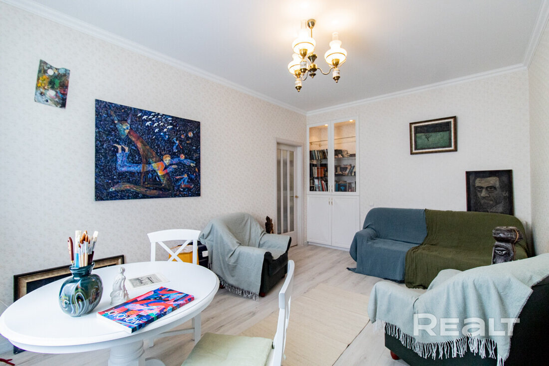 В сталинке в уютном квартальчике на улице Берестянской в районе площади Победы на Realt продают квартиру творческого человека. Судя по всему, художника. Рассказываем об этом жилье подробнее. Квартира находится в четырехэтажном доме на Берестянской, 6. Это такой тихий уголок между улицами Козлова и Чапаева. О жизни здесь мы делали репортаж в прошлом году. Вот расположение дома на карте: Дом построили в 1957 году по проекту советского архитектора литовского происхождения Леонаса Арнаускаса. Он в начале 50-х работал в Белгоспроекте, а потом уехал в Москву. Кстати, он является соавтором спорткомплекса "Олимпийский". Но вернемся к нашему дому и квартире в нем. Это двушка на 52,2 квадрата на третьем этаже. У нее вот такая планировка: Внутри - хороший ремонт, но в первую очередь мы обратили внимание на множество картин, мольберт и кисти в квартире. Судя по всему, это жилье художника. Гостиная в квартире выглядит вот так: В спальне - тоже много картин и уюта. А еще из спальни есть выход на бал