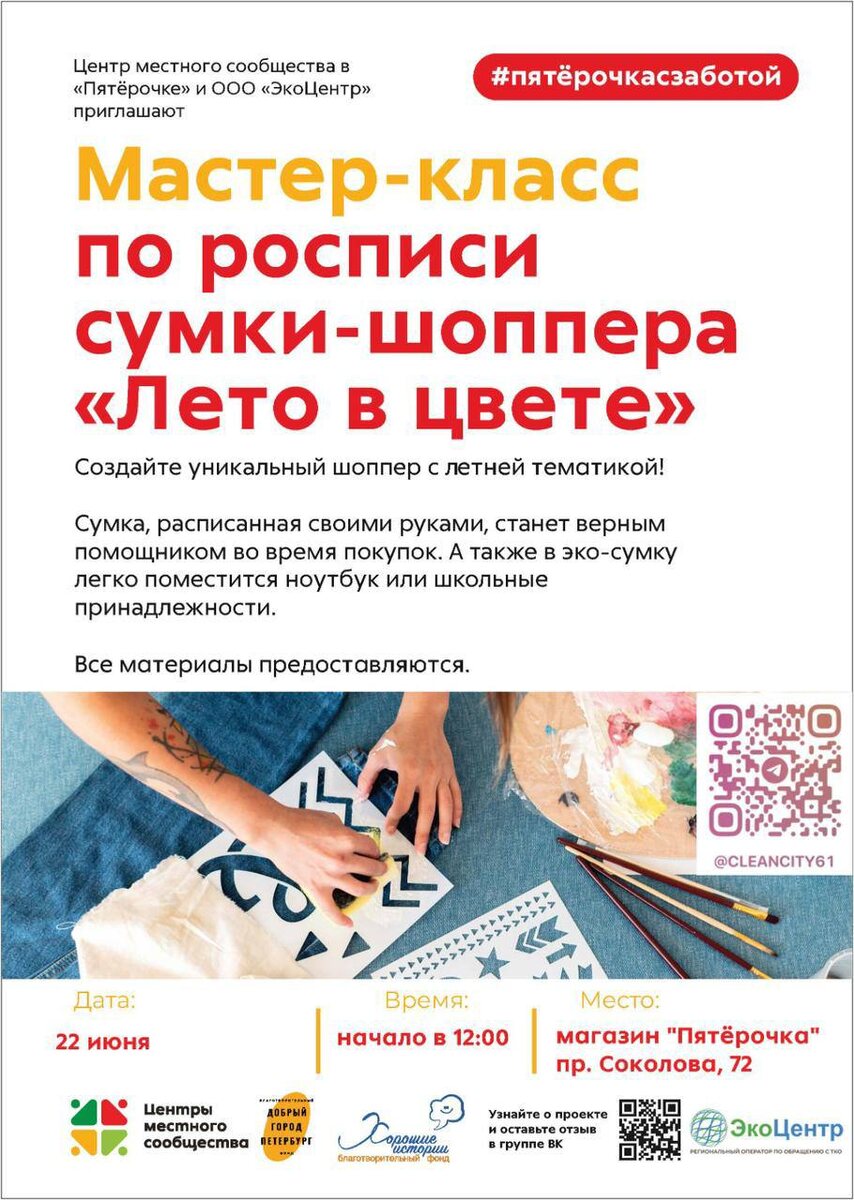 Приглашаем вас на мастер-класс по росписи сумки шоппера. Вы создадите свой уникальный аксессуар, который будет служить надежным помощником и поможет сохранить природные ресурсы Участие бесплатное. Всё материалы предоставляются. 22 июня Начало в 12:00 Магазин «Пятёрочка» пр. Соколова, 72