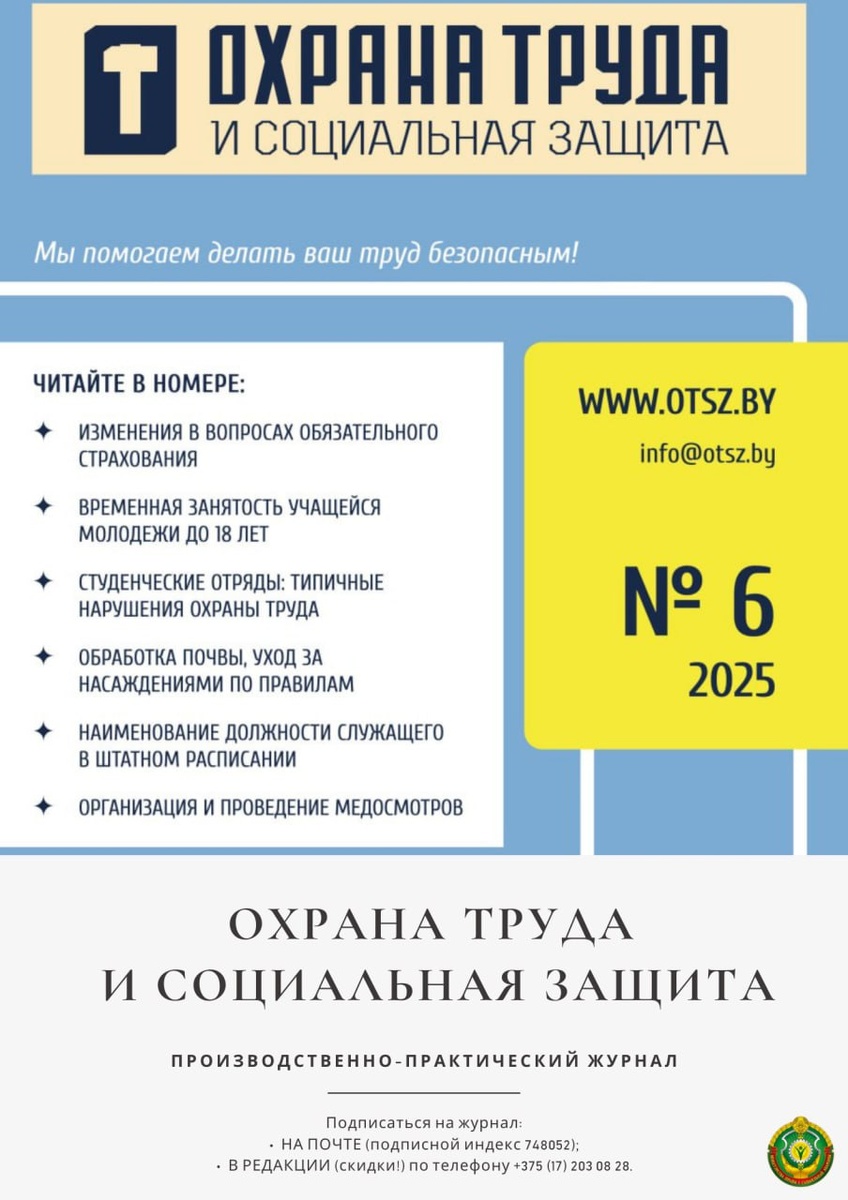 🔔Вышел новый номер журнала «Охрана труда и социальная защита»! №6, 2025 📖 В номере: ▪️Обработка почвы и уход за насаждениями: правильное выполнение ▪️Безопасность работ в емкостных сооружениях ▪️Последствия неоформления трудовых отношений ▪️Расследование и анализ несчастных случаев в организациях ▪️Нюансы организации и проведения медосмотров ▪️Противопожарные мероприятия: основная документация и общие рекомендации ▪️Установление наименований должностей служащих ▪️Временная занятость учащейся молодежи до 18 лет: государственное регулирование, организация и оформление ▪️Изменения в вопросах обязательного страхования ▪️Прямая линия: ответы на вопросы читателей от Минтруда и соцзащиты и Департамента госинспекции труда 📩Подписаться выгодно ▪️На почте (индекс 748052) ▪️В редакции (скидки!): +375 (17) 203-08-28