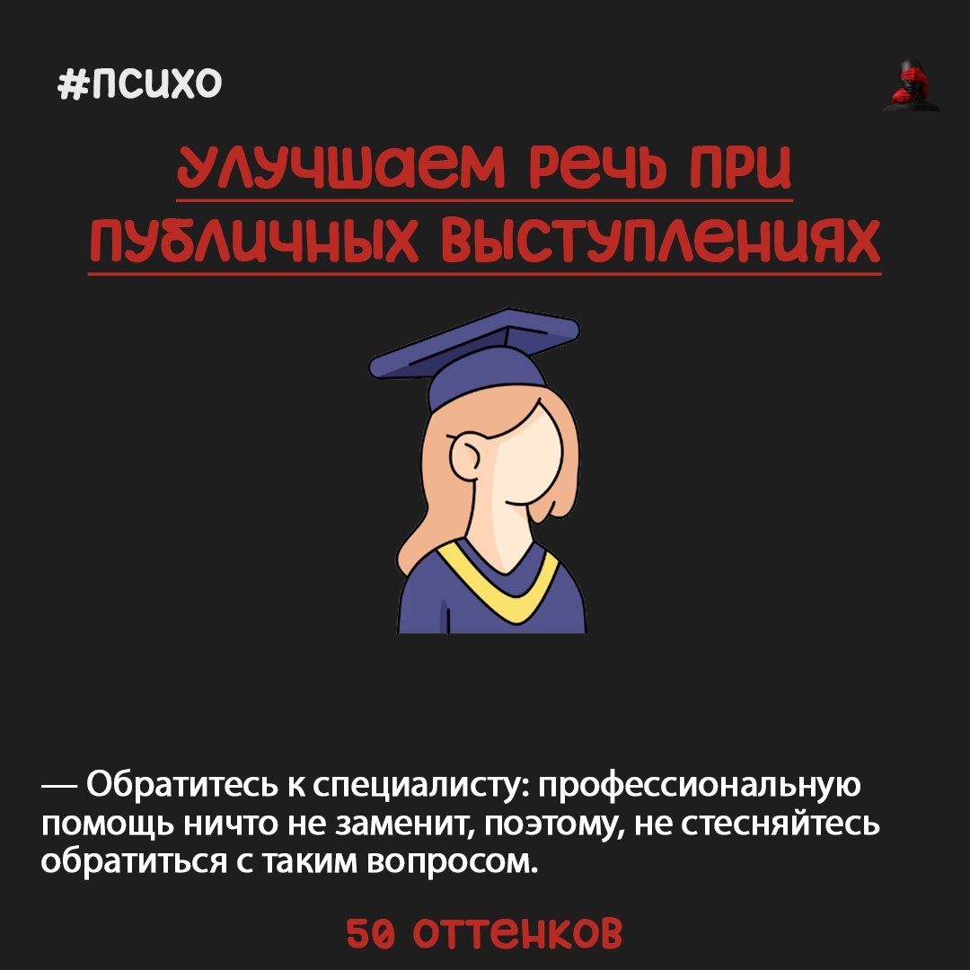 Улучшаем речь при публичных выступлениях — Обратитесь к специалисту: профессиональную помощь ничто не заменит, поэтому, не стесняйтесь обратиться с таким вопросом. — Уделяйте время подготовке: перед выступлением проговорите ещё раз тот материал, который будете транслировать. — Будьте уверенными: даже если что-то идёт не по плану, вы не должны этого показывать. Ведите себя так, будто так и нужно. 📌50 оттенков манипуляций