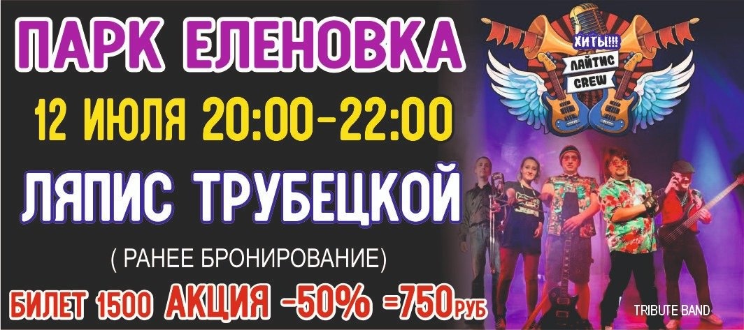 🎉 Впервые в Еленовке! 📅 12 июля | 🕗 20:00 — концерт хитов «ЛЯПИС ТРУБЕЦКОЙ» в исполнении «Лайтис CREW»! 🔥 Этот талантливый коллектив состоит из профессиональных музыкантов, которые подарят вам лучшие и самые яркие песни нашумевшей группы «Ляпис Трубецкой». Вас ждет насыщенная программа, включающая самые популярные и запоминающиеся композиции! 🎸 Приглашаем всех ценителей хорошей музыки — проведите незабываемый вечер в компании отличных мелодий и ярких эмоций! Не пропустите! 🎟 Билеты можно приобрести в кассе парка или на сайте - www.elenovka.ru ‼АКЦИЯ «РАНЕЕ БРОНИРОВАНИЕ» -50%, цена билета 750₽ вместо 1500₽. (Успейте приобрести до 26 июня)! 📍Мы находимся: село Ивановское, Кочубеевский район, 20 км в сторону Черкесска - https://yandex.ru/maps/org/29422796664 🚗🌳 📍Подпишись на актуальные новости в наших соцсетях: 📲 https://dzen.ru/id/65b6852a5485845767ca4ed7 ▶ https://m.vk.com/elenovka26 📍Телефон: 89197577430, 89383000935