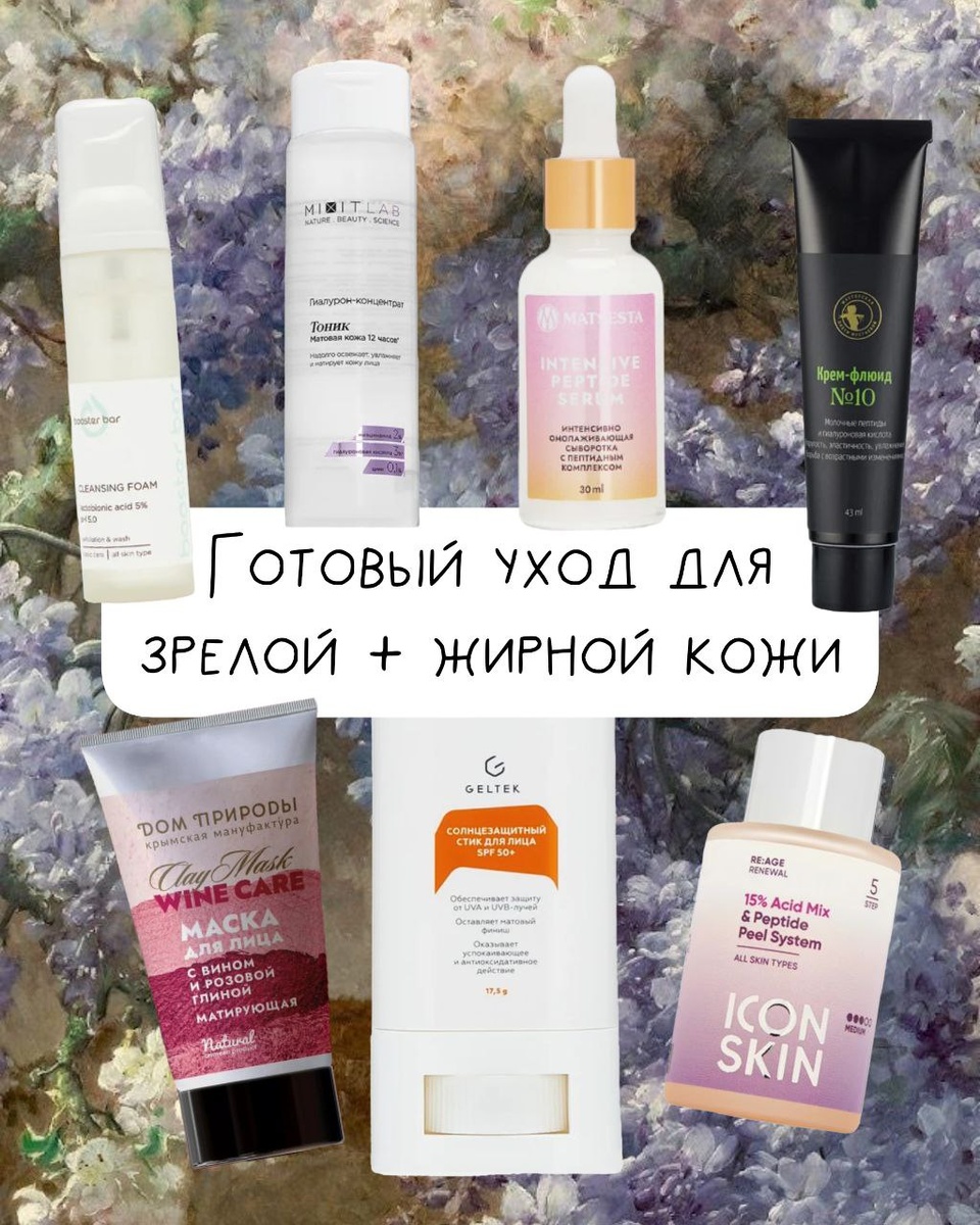 Собрала рабочую схему, которая подтягивает, увлажняет и матирует одновременно. Всё из проверенных российских средств: 1. Booster bar — пенка с лактобионовой кислотой 5% Мягко очищает, обновляет, не пересушивая 2. Mixit — тоник с ниацинамидом и цинком Успокаивает, сужает поры и отлично матирует. С ним лицо не блестит даже в жару 3. Matsesta — лифтинг-сыворотка с пептидами и феруловой кислотой Работает как подтягивающий уход и антиоксидантная защита 4. Мастерская Олеси Мустаевой — крем-флюид №10 Лёгкий, с пептидами и гиалуронкой. Упругость, эластичность и никакой липкости 5. Гельтек — стик SPF 50 Лучшее, что случалось с моей Т-зоной. Матирует до вечера, не комедогенен 6. Icon Skin — пилинг с кислотами 15% Работает на упругость, рельеф и сияние 7. Дом природы — маска с розовой глиной и вином Матирует, выравнивает тон и освежает. Правда пахнет винцом Специально составляю уход так, что бы можно было комбинировать. Если кожа чувствует перегруз: не наносите крем после сыворотки, особе