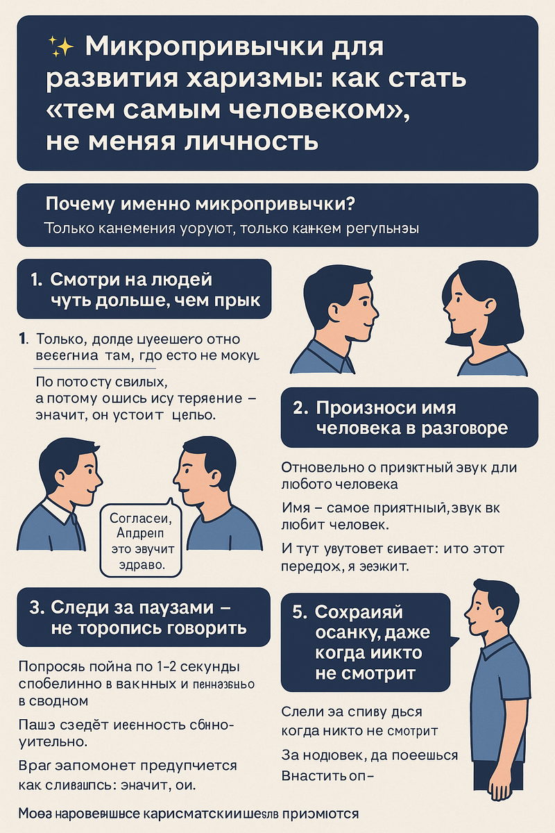 — Он даже в тишине — как будто притягивает внимание. Хорошая новость: харизму можно развивать. И для этого не нужно выступать на сцене. Достаточно встраивать в повседневность простые микропривычки, которые формируют твоё поведение и энергетику. Потому что изменения работают, только когда они регулярны и просты.