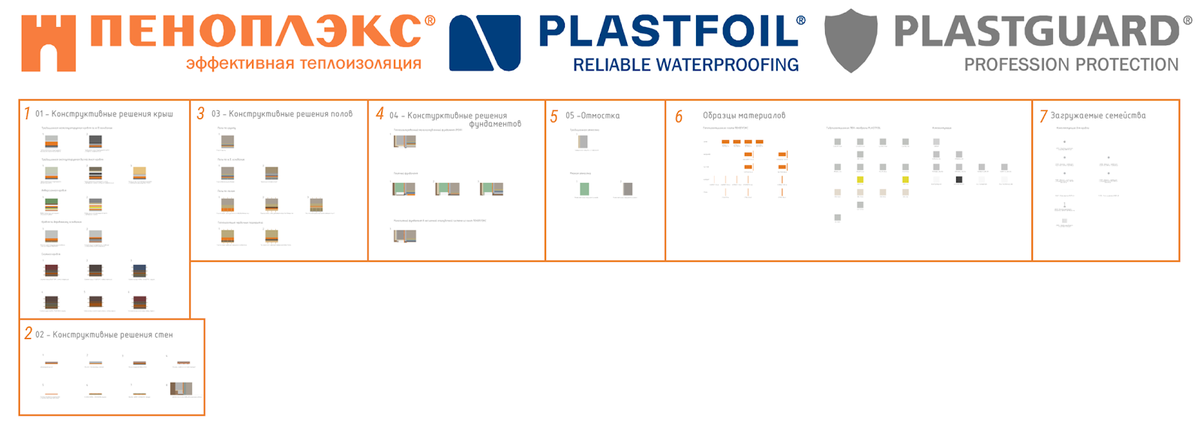 В линейке теплоизоляционных плит ПЕНОПЛЭКС есть марки, которые, как правило, используются в промышленном гражданском строительстве и марки, которые предназначены для индивидуального жилищного строительства. В данной библиотеке по умолчанию в конструкциях используются последние, они же представлены в виде образцов материалов: