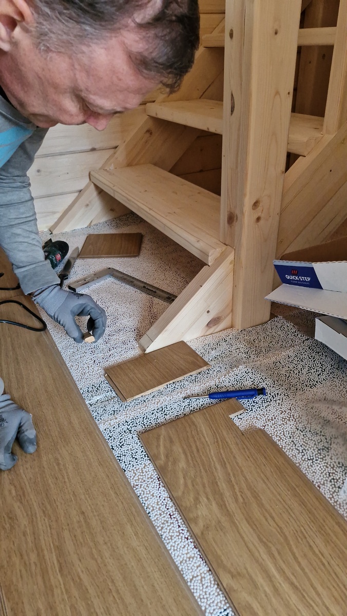 Этот вопрос нам задал несколько недель назад Владислав из Щелково, и вот сейчас мы можем проиллюстрировать ответ, потому что делали именно такой заказ. Если речь идет о частном доме, сначала кладут ламинат или делают чистовую деревянную лестницу на второй этаж? Отвечаем Сначала лестницу. Потому что если поступить наоборот, лестницу придется крепить сквозь ламинат, а этого делать ни в коем случае нельзя. Ламинат - штука "живая", он меняет свой объем в течение года, а сквозной крепеж этому помешает, и потом либо замки разъедутся, либо ламинат встанет дыбом. Но врезка ламината под лестницу - достаточно сложная и тонкая работа, здесь нужно все очень тщательно вымерять, вычерчивать, еще раз проверить прежде чем пилить. Углы лестницы, которые мешают точной стыковке с ламинатом, мы срезаем Между ламинатом и лестницей нужно оставить зазор под расширение, и эстетично его оформить. К нижней ступеньке также примыкает плинтус. Благодаря правильным промерам все получилось очень аккуратно - мы сами