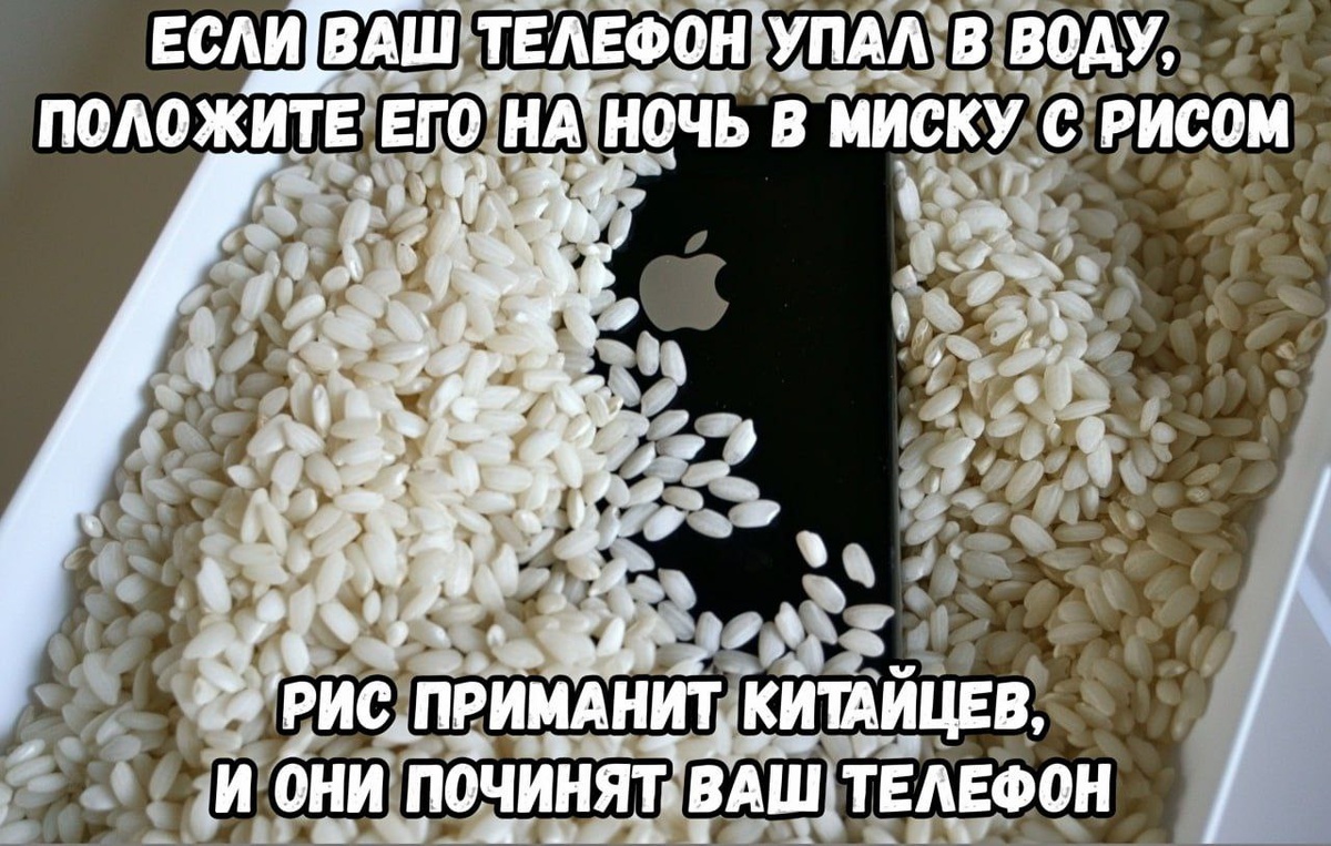 Рис УБИВАЕТ утопленные смартфоны — эксперты развеяли популярный миф про сушку. Крупа не спасает, а наоборот — мелкие крошки могут забиться в разъёмы и добить ваш гаджет. Никакого риса, фена и микроволновок. Хотите спасти телефон — повторяйте: — Выключить; — Протереть мягкой тканью; — Аккуратно вытряхнуть воду, направив зарядным портом вниз; — Оставить сушиться на воздухе, лучше под вентилятор.