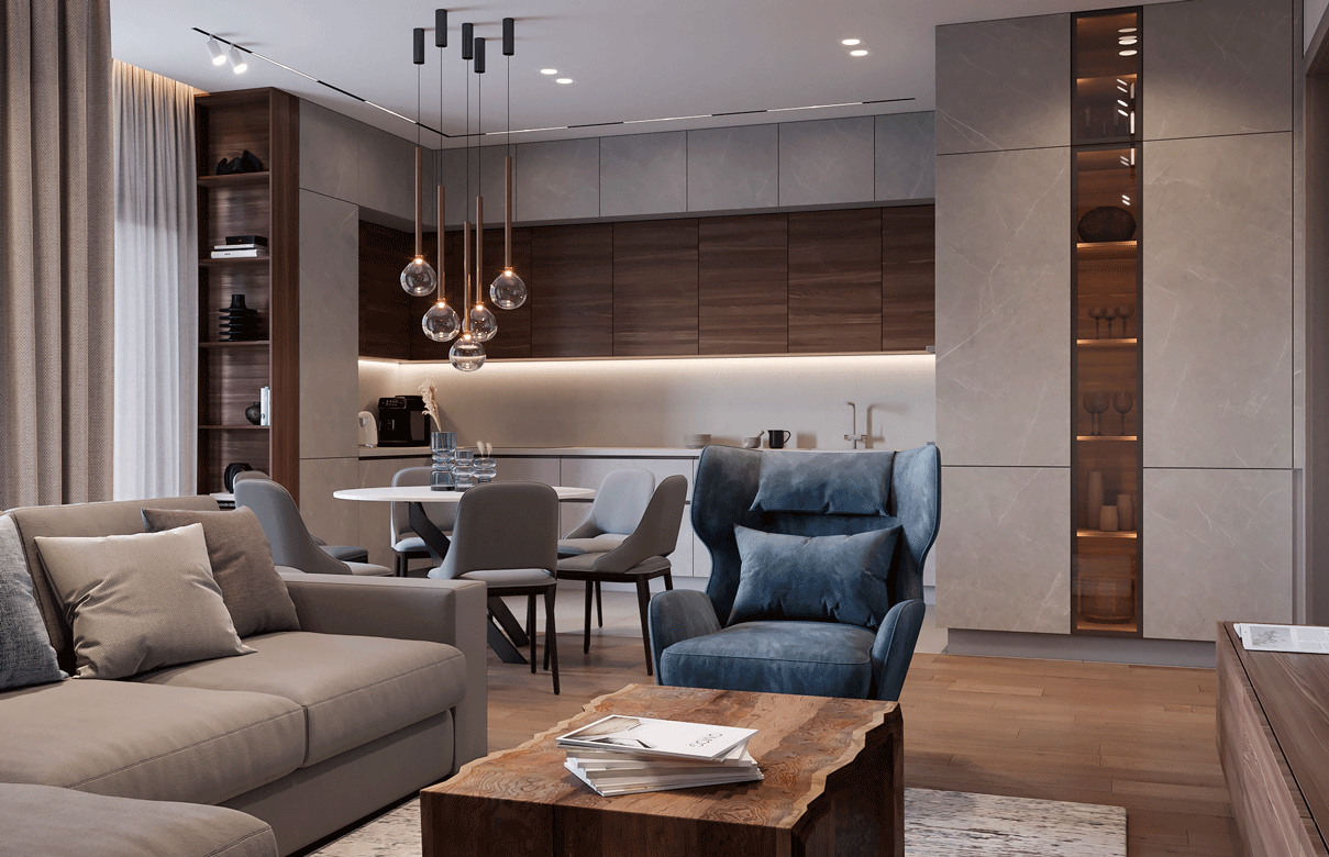 📍Просторная квартира 160 кв. метров расположена в ЖК «ЗИЛАРТ». Пространство образовано после объединения двух соседних квартир. Так как на этаже расположены всего две эти квартиры, прихожую с гардеробной сделали в общем коридоре этих двух квартир. Заказчики этого проекта- семейная пара с сыновьями 3 и 5 лет. Квартира разделена на две функциональные зоны. Общественную (дневную) и приватную. В общественном пространстве расположили кухню-гостиную, кабинет, прачечную и гостевой санузел. На лоджии при гостиной небольшое рабочее пространство. На кухне-гостиной расположена вместительная кухня, сделанная на заказ, ее фасады изготовлены из тонкого керамогранита и шпона грецкого ореха. В пространстве гостиной разместили просторный угловой диван, кресло, журнальный стол из слеба дерева. Телевизор с тумбой размещены на декоративной стене с подсветкой, облицованной керамогранитом с рисунком под мрамор. В прачечной разместили стиральную машину, сушильную машину и мойку. Рядом с прачечной расположи