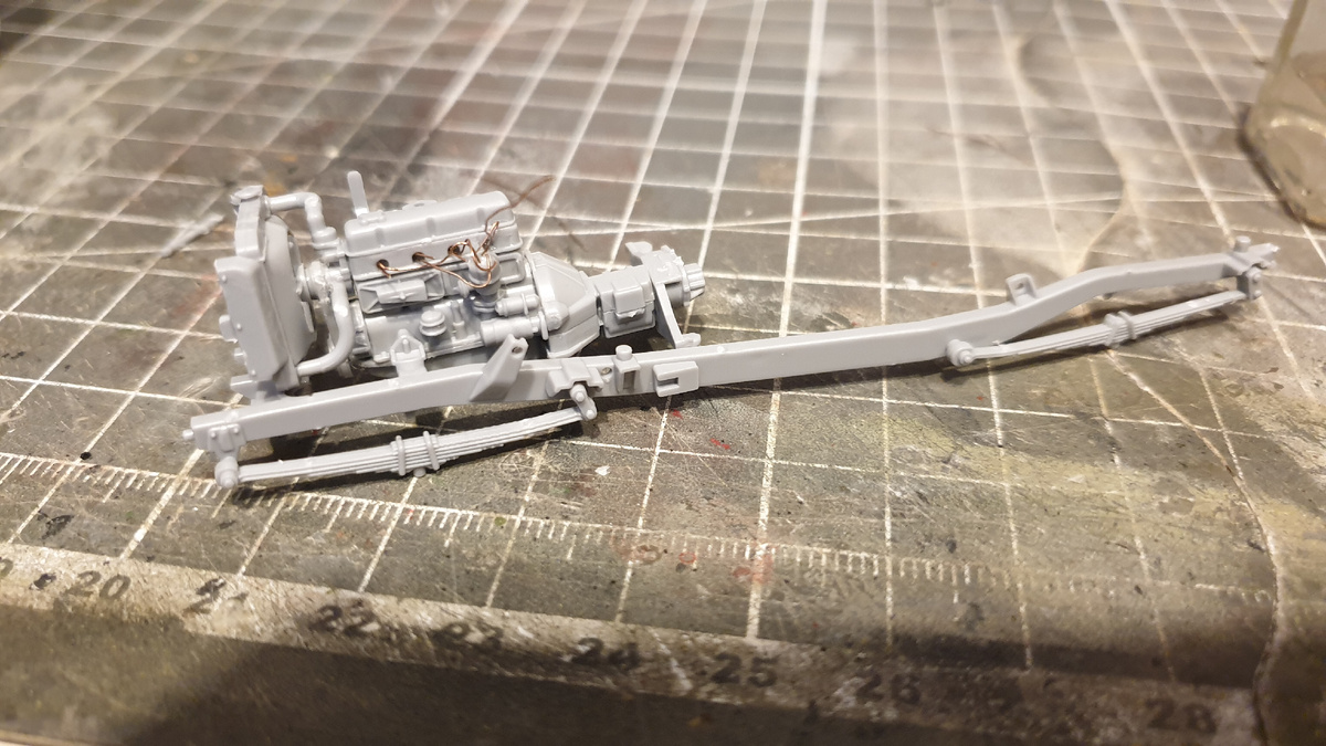 Приветствую вас, уважаемые подписчики и зрители! Сегодня мы будем собирать шасси для автомобиля УАЗ-469. Сборку начинаем с установки рессор на продольные элементы рамы. К двигателю приклеиваем радиатор, и устанавливаем их к одному из элементов рамы.