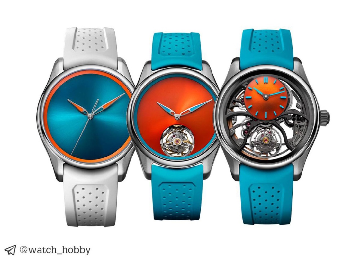 H. Moser & Cie. представили сразу тройку часов к лету: Pioneer Spiced Aqua. Вся тройка похожа друг на друга, но это на первый взгляд. Их всех объединяют два ярких оттенка - оранжевый и бирюзовый. А дальше тебе лишь нужно выбрать то, что больше по душе. Корпуса выполнены из стали и могут быть дополнены голубым или белым каучуком, а также стальным браслетом. Диаметр разный, от 40 до 42.8 мм. Первая модель самая доступная - 14.500 франков 💰. За эти деньги вы получите ярко-бирюзовый циферблат с оранжевым ободком и, конечно, три элегантные стрелки. Циферблат лишен индексов и логотипа. За работу отвечает калибр HMC 201. Вторая модель уже посложнее, но все еще похожа - 49.900 франков 💰. Особенностью стал минутный турбийон, который расположили на «6 часах». Циферблат ярко-оранжевый, ободок уже бирюзового цвета. Индексов и логотипа также нет. За работу отвечает калибр HMC 805. Третья модель самая изысканная, самая дорогая, но я не назвал бы ее самой красивой - 79.000 франков 💰. Здесь вс