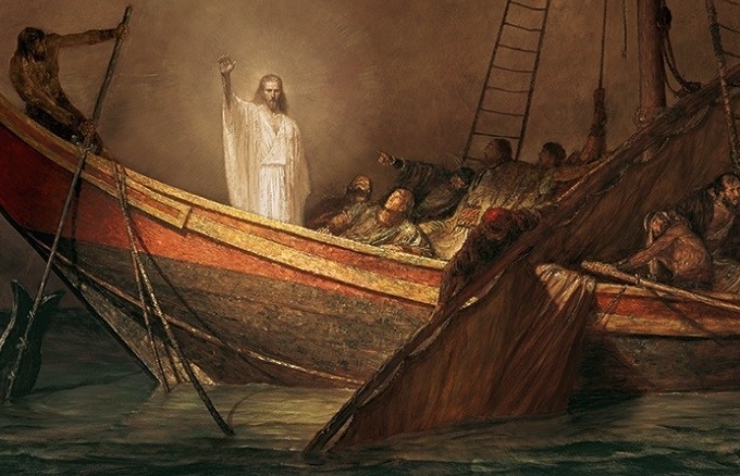 "И когда вошел Он в лодку, за Ним последовали ученики Его. И вот, сделалось великое волнение на море, так что лодка покрывалась волнами; а Он спал.