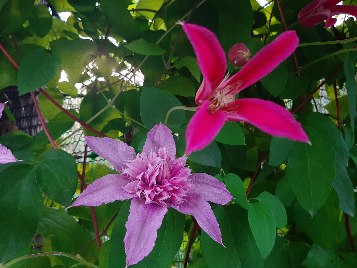 Уже второй год я наблюдаю лицезрею форменный беспорядок на своём заборе, там растут рядом три сорта клематисов, посажены они были в один год В теории всё было прекрасно рассчитано, но, как это часто бывает в отдельно взятом саду, теория с практикой разошлась. По моей задумке рядом должны были цвести три сорта клематисов розового цвета, но, тут, как обычно начались нюансы, оказалось, что один из сортов японской селекции распускается совсем рано, практически одним из первых после княжиков и конечно со своими соседками не встречается. Ладно, я это проглотила. Дальше по гениальной задумке автора два сорта клематисов, разные по размерам цветов и оттенкам должны были встретиться в обильном цветении и обнявшись радовать свою хозяйку. Ну, типа, так. Этой влюблённой парой были назначены клематисы Multi Pink и Princess Diana, но оказалось, что у них разные темпы роста, хотя оба относятся к третьей группе обрезки. К Multi Pink у меня никаких претензий нет. У этого сорта прекрасная особенность, ко