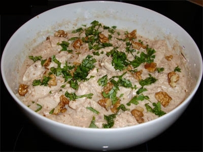 - Отварную рыбу залить еще не остывшим ореховым соусом, потом дать ей остыть самой. Затем затянуть пищевой пленкой или накрыть крышкой, убрать в холодильник часов на 10-12, чтобы белуга впитала в себя все ароматы (орехов и специй). Подавать к столу в холодном виде.