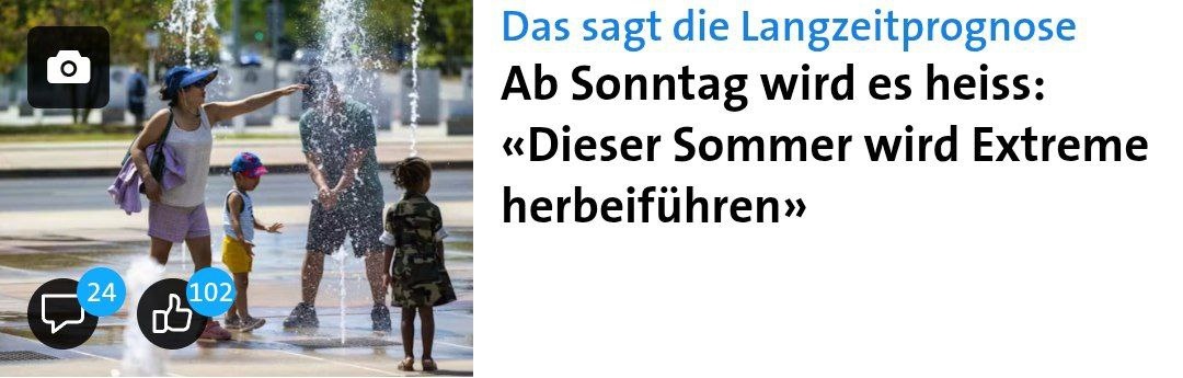 📌 " В начале июня температура воздуха поднималась до 30 градусов, а со следующей недели ожидается до 36 градусов - причиной тому горячие пустынные ветры из Северной Африки. Метеорологи ожидают, что в 2025 году по стране произойдет несколько тепловых волн и температура будет выше средней. В таких городах, как Люцерн, количество жарких дней увеличилось в несколько раз с 1980-х годов - прямое следствие изменения климата, по данным MeteoSwiss.