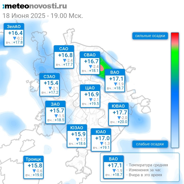 В 19:00 в Москве было от +15°C до +18°C, средняя температура +16.5°C #погода #Москва #лето #температура #18июня #среда