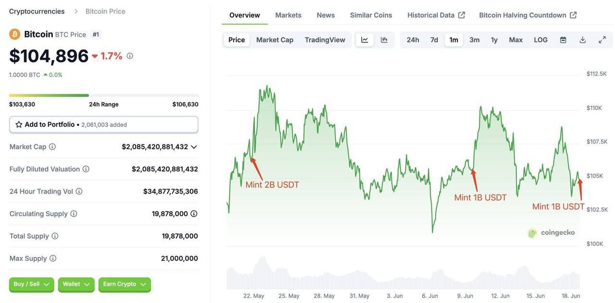 🪙 Tether снова напечатал 1 млрд USDT ⠀ 🕯 Это уже не первый раз, когда Tether заливает рынок ликвидностью, и трейдеры начинают гадать: Полетит ли BTC вверх в ближайшие дни? 💻 Исторически выпуск крупных объемов USDT часто совпадал с ростом цены биткоина: — в апреле 2023 — BTC вырос на 18% после печати, — в декабре 2023 — +12% за 5 дней, — в феврале 2024 — старт буллрана с $42k. ⚠️Но есть нюанс: Не всегда это приводит к пампу. Иногда капитал уходит в альты или просто паркуется на биржах. 🤔 Так что история может повториться, а может и нет — рынок сейчас очень чувствителен к макро и ETF-притокам. 👀 Следим за движениями на биржах и китами!