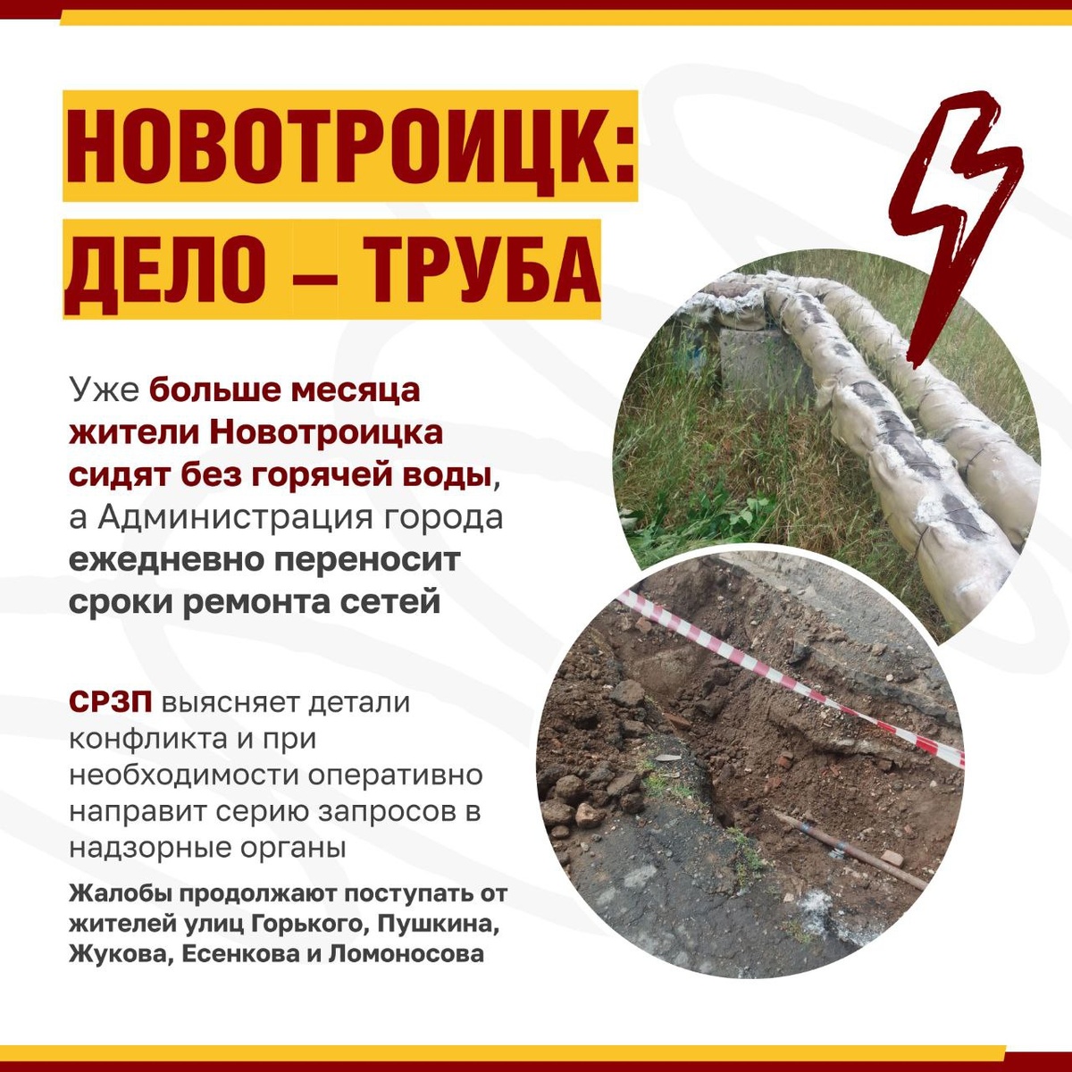 ❗️🎺 В Новотроицке дело труба: Уже больше месяца жители Новотроицка сидят без горячей воды, а Администрация города ежедневно переносит сроки ремонта сетей Рассказываем предысторию. 15 мая 2025 года в Новотроицке перекрыли горячее водоснабжение в части города, обещая провести ремонт и опрессовку теплосетей до 24.05.25 — время шло, а ремонт всё не начинался. На вопросы жителей в Администрации ответили, что ремонт может задержаться из-за ремонта теплотрассы до 28.05, но в целом всё идёт по плану. 📆 Наступил июнь, но горячая вода в квартирах жителей так и не появилась — без коммунальных удобств остались многодетные семьи, пенсионеры и работники местных предприятий. По сей день местные чиновники почти ежедневно сдвигают сроки восстановления теплоснабжения. Жители в расстеряности, жалобы продолжают поступать от жителей улиц Горького, Пушкина, Жукова, Есенкова и Ломоносова. Знаем, что нас читают представители администраций — призываем обратить внимание на проблему, дать внятный ответ жите