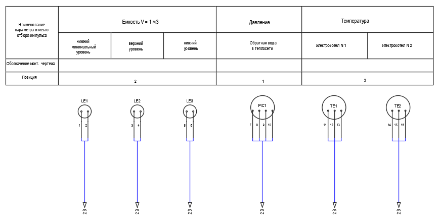 Кабели на проводниках обычно размещаются с помощью инструмента Обозначения кабелей. Рассмотрим инструмент Несколько обозначений кабелей, который позволяет за одну операцию вставить в проводники несколько жил кабелей. Например, имеется проект, состоящий из двух листов. На первом листе («Схема внешних проводок») размещены датчики, от которых провода собираются в жгуты и переходят на второй лист. На втором листе («Кабельные подключения») жгуты разделяются на провода и подключаются к клеммнику ХТ. Датчикам назначен код Места - М (приборы по месту). Клеммник размещен в шкафу – код Места – SH. Открывает первый лист. Запускаем команду Несколько обозначений кабелей. В диалоге «Обозначения нескольких кабелей» выбираем область извлечения проводов - Проект и нажимаем кнопку ОК. Выбираем чертежи проекта для обработки и нажимаем кнопку ОК. Выбираем коды мест в проекте для включения в отчет о жилах кабеля и нажимаем кнопку ОК. В диалоге «Вставить / отредактировать кабель» в поле Позиц. обоз. кабеля
