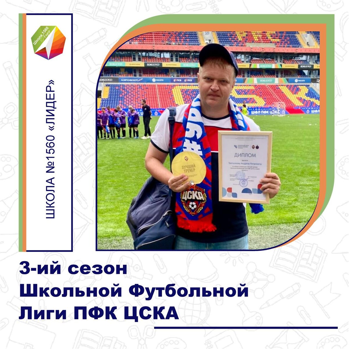 Семь игроков, один тренер и огромное желание играть в футбол — так стартовал для нашей команды «Олимп» школы №1560 «Лидер» 🏫📚🎓 3-ий сезон Школьной Футбольной Лиги ПФК ЦСКА. Несмотря на небольшой состав, ребята прошли длинный путь и смогли добиться впечатляющего результата. На финальном этапе, в золотой группе, команда одержала 4 победы из 5, набрав 12 очков. До выхода в финал четырех не хватило всего нескольких забитых мячей. Но и 5-е место среди 36 сильнейших школьных команд Москвы — это уже повод для гордости. По итогам сезона тренер сборной школьного спортивного клуба «Олимп» #Школа1560Лидер Андрей Петрович Третьяков был признан лучшим тренером ШФЛ ЦСКА сезона 2024/25. Торжественное награждение состоялось на ВЭБ Арене ЦСКА. Награду вручил лично генеральный директор клуба. 💬 «Сезон завершен, но впереди — новые цели, матчи и победы. От всей команды выражаем благодарность директору школы, Татьяне Александровне Цуркан, за постоянную поддержку нашей команды», - отметил Андрей Пет