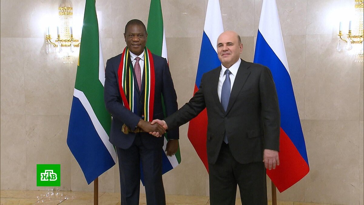 [ Смотреть видео на сайте НТВ ] ЮАР — одного из лидеров Глобального Юга — на экономическом форуме в Санкт-Петербурге представляет вице-президент Пол Машатиле. Сегодня состоялась встреча Пола Машатиле с главой правительства России Михаилом Мишустиным. Российский премьер подчеркнул, что на ПМЭФ пройдет специальная сессия, посвященная развитию делового и инвестиционного сотрудничества между двумя странами. «По линии правительств мы обеспечиваем выполнение договоренностей лидеров России и ЮАР о расширении сотрудничества», — отметил Мишустин, добавив, что речь идет о промышленности, энергетике, сельском хозяйстве, цифровой экономике и гуманитарном сотрудничестве. Завтра в Санкт-Петербурге запланирована встреча вице-президента ЮАР с Владимиром Путиным. [ Смотреть видео на сайте НТВ ]