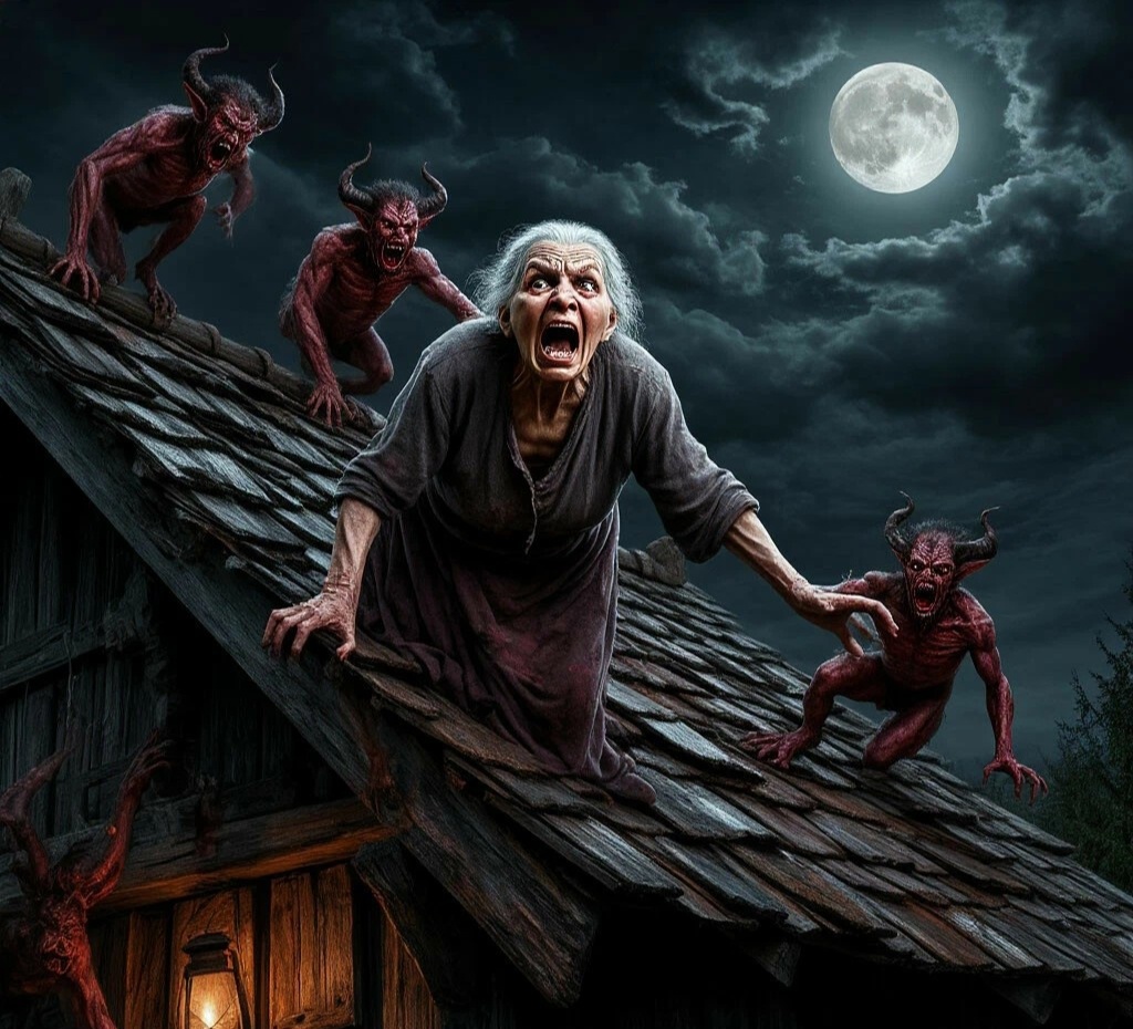 Когда с крыши сняли часть досок, бабушка увидела невообразимое. Та самая ведьма вырвалась наружу. Вернее, это была её душа. Её окружили черти. Она визжала, а те тянули и рвали старуху на части.