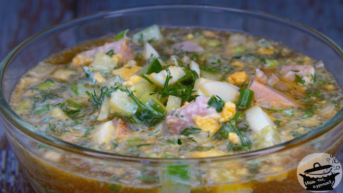 мясо, яйцо и огурец порезать небольшим кубиком, зелень мелко порезать. Добавить сметану, смешать все ингредиенты, залить квасом и дать настояться 1 час.