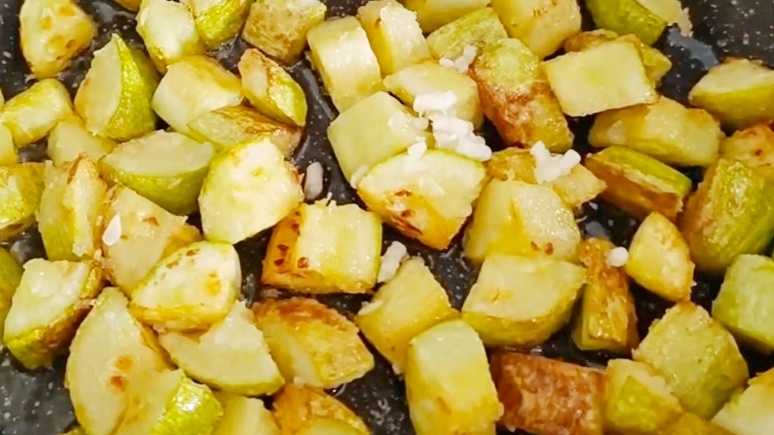 В большой миске смешиваем картофель, кабачки, лук и чеснок. Добавляем растительное масло, соль, перец и специи. Хорошо перемешиваем, чтобы овощи равномерно покрылись маслом и специями.