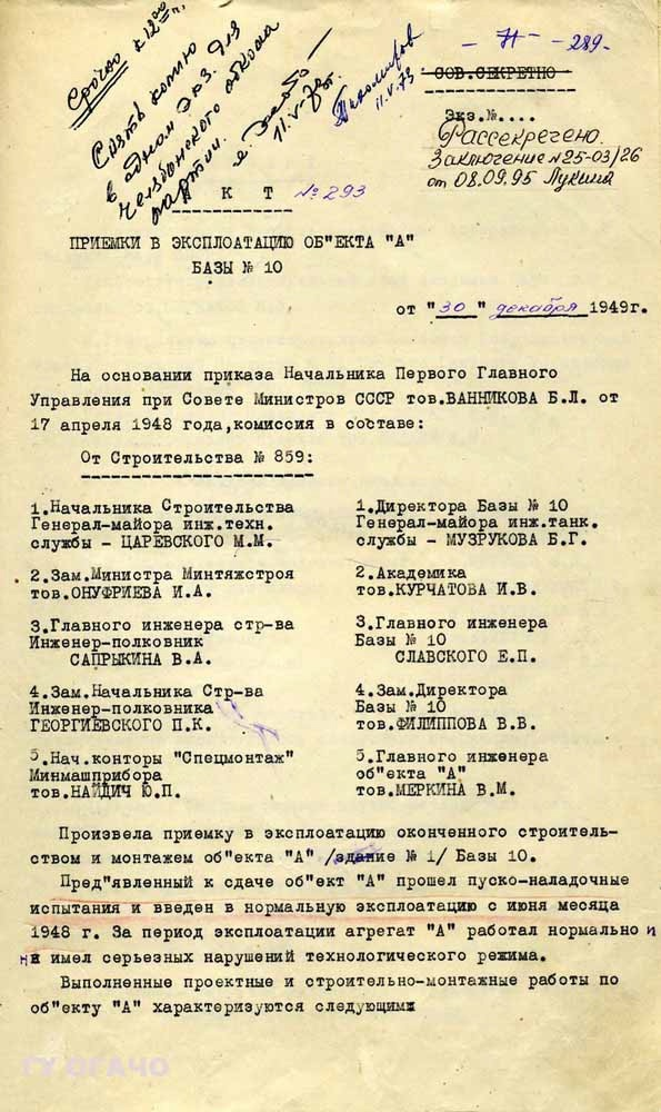 С июня 1948 года объект "А" (реакторный завод) введён в нормальную эксплуатацию. С 19 июня 1948 года ПО "Маяк" ведёт свою историю как оборонный атомный комплекс. Актом от 30 декабря он признан ещё и принятым в эксплуатацию после пуско-наладочных работ.