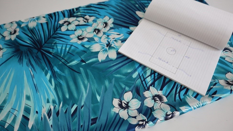 Берем нашу ткань и отмеряем прямоугольник 70 на 115 см. Складываем прямоугольник в 4 раза. От угла, который будет центром будущей горловины, откладываем по 11 см. С помощью мела или мыла рисуем полукруг между этими точками. Это и есть будущая горловина. Вырезаем ткань по линии. Затем разворачиваем ткань — в середине получилось круглое отверстие. Это наша горловина, диаметром 22 см. Все края обметываем. После этого горловину обрабатываем самым простым способом: подвора